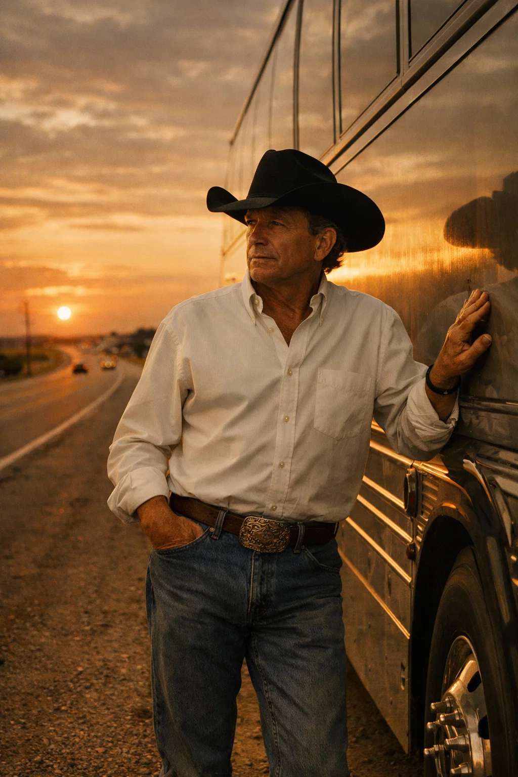 Picture this: the sun sinking behind a stretch of open highway. A tour bus parked in silence. George Strait standing alone for a moment — one hand in his pocket, the other resting on the metal that has carried him through decades of music, faith, and reflection.